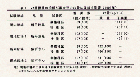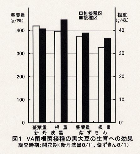 - 市販VA菌根菌資材を混和した培土で育苗した黒大豆をほ場で栽培すると、根粒着生量、根重及び着莢数が増加して増収効果が得られる。