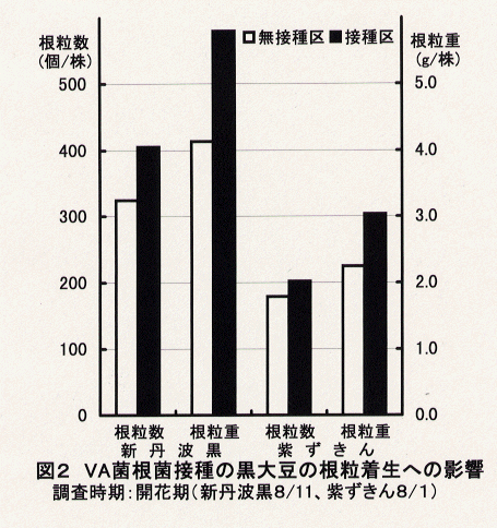 - VA菌根菌接種区(以下、接種区)では黒大豆1個体に着生する根粒数、根粒重が無接種区に比べて増加する(図2)。
