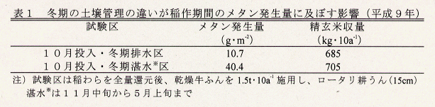 - 乾燥牛ふんを秋施用(10月)しても冬期に湛水すると、メタン発生を助長する(表1)ので、耕うん後はほ場排水に努める。