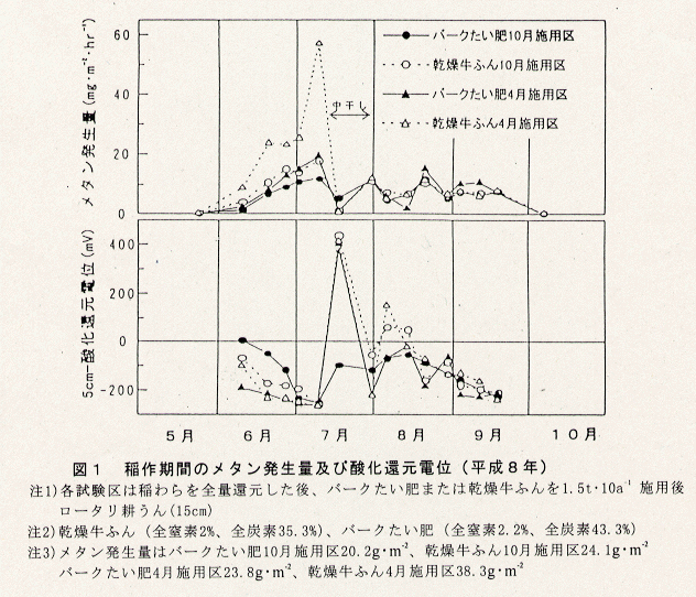 - バークたい肥と乾燥牛ふんの秋施用(10月)においては春施用(4月)よりメタン発生量が少なくなり、両者を比較すると乾燥牛ふん施用の方がメタン発生量は多い。しかし、中干しにより土壌の酸化還元電位を上昇させるとメタン発生量は減少する(図1)。