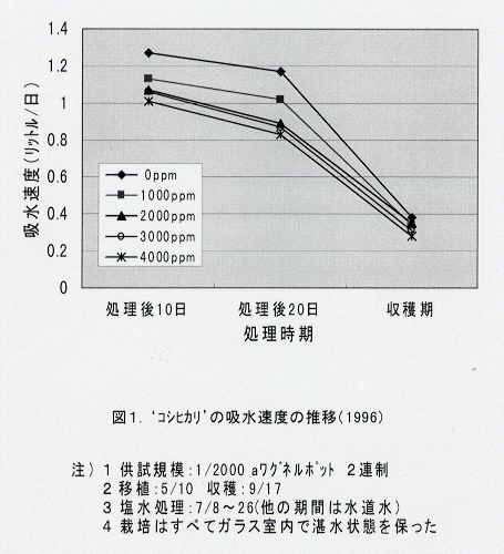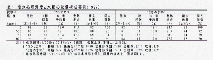 - ‘コシヒカリ’‘ときめき35’の収量に大きく影響を及ぼす、かんがい水中の塩分濃度はNaCl 750ppm(EC、約1.5 mS/cm)からである。塩害により最も収量に影響を受ける時期は最高分げつ期から幼穂形成期である。