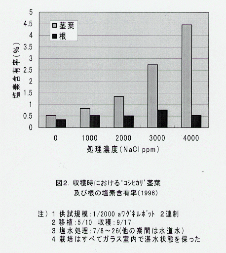- ‘コシヒカリ’の吸水力は、塩分(NaCl)処理濃度が高いほど低下する。無処理区に対する吸水速度の差は1000 ppmから大きくなり、2000 ppmを超えると大差がなくなる(図1)。また、収穫時の茎葉の塩素含有率は1000 ppm処理区で0.83%(8300 ppm)と水稲の過剰障害判定基準の約3倍の含有率を示し、処理濃度が高いほど増加する(図2)。これらのことから、かんがい水中の塩分濃度が1000 ppmを超えると根の活性が大きく低下し、根の塩分排除機能に影響を及ぼし、生育に影響するものと推察される。