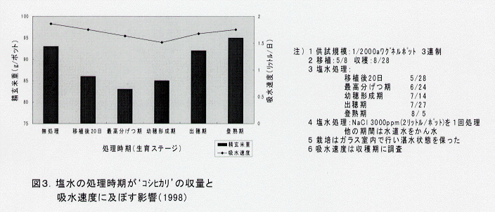 - 塩水の処理時期が根の吸水力に与える影響は、幼穂形成期に最も大きくなる。また、精玄米重に与える影響は、最高分げつ期が最も大きく、次いで幼穂形成期、移植後20日の順である(図3)。これらのことから最高分げつ期から幼穂形成期が、塩害を最も受けやすい時期であると考えられる。