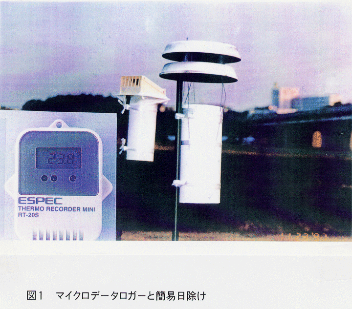 - 気温の測定は、簡易な日除けをつけたマイクロデ−タロガ−方式の温度計による(図1)。設置費は1地点当たり一万数千円である。デ−タ採取は数ヶ月間隔でもよいため、従来は極めて困難であった数十から数百地点の気温の測定が容易に行える。
