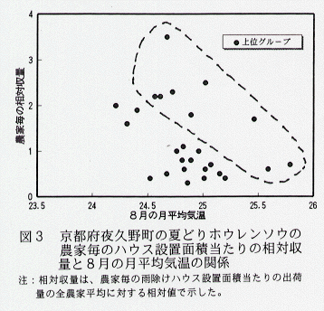 - 関係図(図3)の同一気温における収量の差は農家の栽培施設の設備や管理技術等の差による。収量の高いグル−プの気温に対する傾きから、気温が収量に及ぼす影響の強弱を判定する。図3の夜久野町の夏どりホウレンソウの場合、わずか1〜2℃気温が低下すると収量が大きく増加するので、栽培地を気温のより低い地区に移動する効果は極めて高いと判定できる。