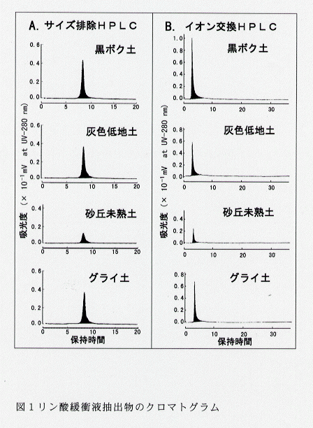 - 土壌のリン酸緩衝液抽出物をサイズ排除およびイオン交換HPLCで分析すると、土壌の種類に関わらず、単一のピークしか検出されない。このことから、リン酸緩衝液可溶有機態窒素は化学的に均一なタンパク様物質で(図1B)、保持時間から推定される分子量は、8,000〜9,000程度と考えられる(図1A)。