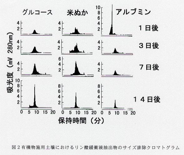 - 土壌中で無機化される窒素の供給源と考えられるリン酸緩衝液可溶有機態窒素は分子量8,000〜9,000程度の比較的均一なタンパク様物質と推定され、ニンジン、 チンゲンサイはこれを直接吸収する可能性が高い。