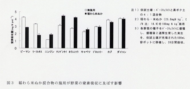 - 土壌に稲わら・米ぬか混合物を施用すると、土壌中の無機態窒素量は無施用よりも低くなり、稲わら・米ぬか施用区におけるピーマンおよびリーフレタスの窒素吸収量(栽培28日後)は無施用区よりも低くなる。しかし、ニンジン、チンゲンサイおよびホウレンソウの窒素吸収量は稲わら・米ぬか施用区のほうが無施用区よりも高くなる(図3)。