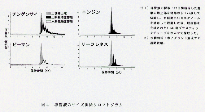 - サイズ排除HPLC分析において、稲わら・米ぬか区のチンゲンサイおよびニンジンから採取された導管液中には土壌のリン酸緩衝液抽出物と同様なピークが検出されるが、ピーマンおよびリーフレタスには検出されない。また、水耕栽培されたチンゲンサイの導管液にもこのピークは検出されない。このことから、チンゲンサイおよびニンジンは土壌中に集積されるリン酸緩衝液可溶有機態窒素を直接吸収している可能性が高いと考えられる(図4)。