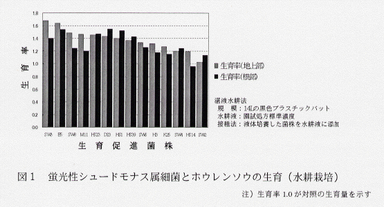 - ホウレンソウを収穫期まで湛液水耕法にて栽培し、各種の野菜栽培土壌及びホウレンソウ根圏から分離した約500菌株の蛍光性シュードモナス属細菌の中から、収穫時においてホウレンソウの生育(地上部&根部)を促進する機能を持つ菌株を数菌株選抜した(図1)。