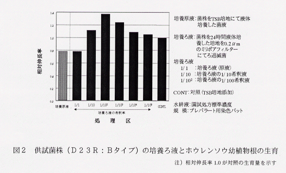 - PGPRとして選抜した菌株には、2種のタイプが存在し、Aタイプは生育初期から根の生育を促進する(データ略)。Bタイプは菌体を含む培養原液及びそのろ過滅菌液の両者ともに、ホウレンソウ生育初期の幼植物根の生育を抑制する(図2)。Bタイプの菌株の生育促進機作は、培養原液のろ過滅菌液を希釈した溶液を生物検定法に供試すると幼植物根が1以上の相対伸長率を示すことから(図2)、菌体外分泌物質又は微生物代謝産物によると考えられる。