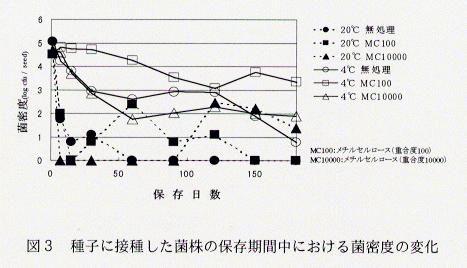 - PGPRを接種したホウレンソウ種子を1%メチルセルロース(重合度100)で処理後、4℃で保存することにより、長期(6ヶ月)にわたり種子の菌密度は高く推移し(図3)、保存後の種子の発芽率も90%程度である。また6ヶ月保存後の種子を市販育苗培土に播種栽培後、接種菌は根に定着しており、この保存法はPGPRをホウレンソウの根に定着させる上で有効である。