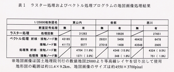 - ラスター処理とベクトル処理プログラムを組み合わせることにより、未処理の場合に30,000〜46,000箇所生じる断線・接触箇所の84〜90%が修正され、特に接触箇所に限ると96〜98%の修正を行うことができ、等高線データの作成作業の効率化が図れる(表1)。
