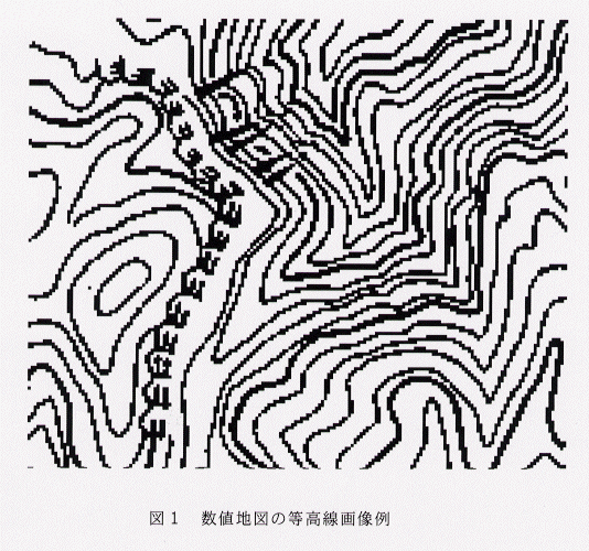 - 中山間地域では、原図となる地図画像において、隣接する等高線同士の接触や断線が多く見られ(図1)、そのままではメッシュ標高データへの変換時にエラーが生じる。その修正作業には多大な時間と労力を要することから、作業の省力化を図るための地図画像画像処理プログラムを開発した。