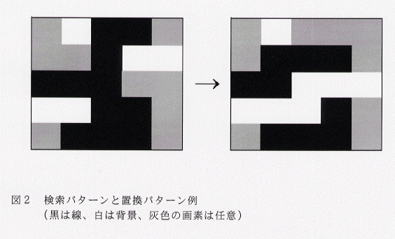 - ラスター処理では、フィルタリング手法により処理を行う。この処理は等高線の接触箇所を検索するためのパターンとその修正のための置換パターンをあらかじめ作成し、画像ファイルを順次読み取って、検索パターンとの間で局所的なマッチング(照合)処理を繰り返して、修正を行う(図2)。