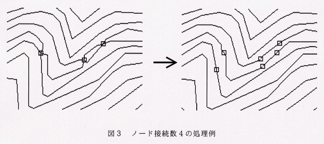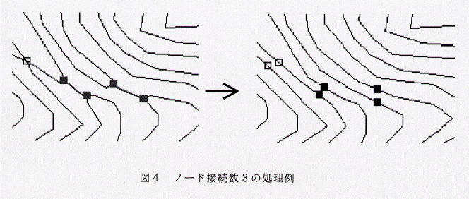 - ベクトル処理では、ベクトルデータが結合した場合は共通のx、y座標を線の両端(ノード)に持つことを利用し、ノードを共有するベクトル数(ノード接続数)によって、接触・結合したベクトルを検索し、修正を行う(図3、図4)。