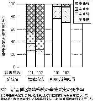 | [要約] | 強い辛味果実の発生が問題となっている万願寺トウガラシについて、葯培養を利用して、辛味果実の発生が極めて少ない品種を育成した。本品種は、舞鶴系統に比べて、早生で初期収量が多く、果実はやや短くて太い。 |