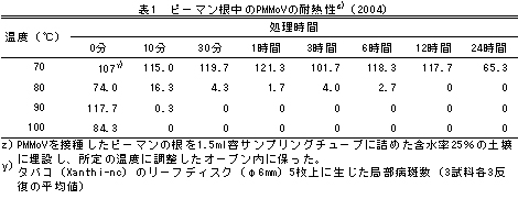 | [要約] | キャンバスホース法による蒸気土壌消毒は、トウガラシマイルドモトルウイルスによる ピーマンモザイク病の土壌伝染防除に有効である。 |