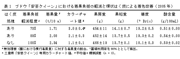 | [成果情報名] | 環状はく皮と着果負担の軽減の組み合わせによる温暖地ブドウの着色向上 |