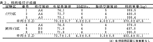 | [要約] | 肥育前期と後期に飼料イネWCS(ホールクロップサイレージ)(以下「飼料イネWCS」)を、 肥育中期にイナワラを給与することでビタミンA制御肥育ができ、一定の枝肉格付等級が確保されるものの、 全期間飼料イネWCSを給与する方が枝肉重量、収益性ともに良好である。肥育牛への飼料イネWCSの給与は 有効であり、粗飼料自給率向上の一助となる。 |