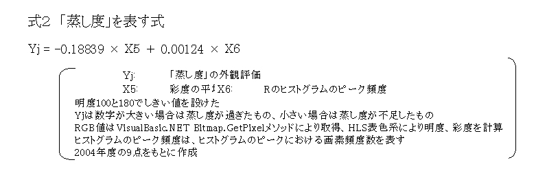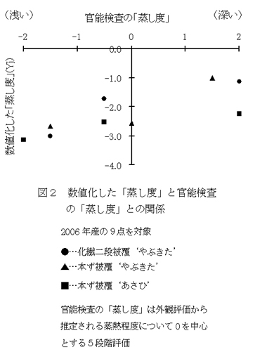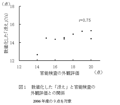 | [要約] | てん茶の外観評価について、デジタルカメラで撮影したてん茶の外観画像から色情報を取得し、外観の 評価項目である「冴え」と、蒸熱程度の指標である「蒸し度」を数値化して評価できる。 |