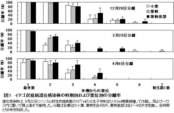 | [要約] | ベノミル剤耐性菌を対象に作製した選択培地により潜在感染株や鉢土から炭疽病菌が分離できる。潜在感染株は外側葉位の小葉や葉柄、葉柄基部から炭疽病菌が高率に分離され、内側葉位になるほど低下する。炭疽病菌の分生子は培養土で生存し、感染源となる。 |